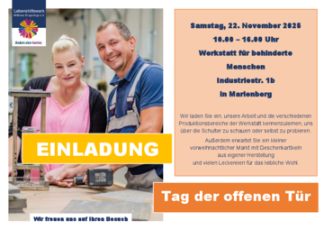 Wir laden Sie ein, unsere Arbeit und die verschiedenen Produktionsbereiche der Werkstatt kennenzulernen, uns über die Schulter zu schauen oder selbst zu probieren. Außerdem erwartet Sie ein kleiner vorweihnachtlicher Markt mit Geschenkartikeln aus eigener Herstellung und vielen Leckereien für das leibliche Wohl.